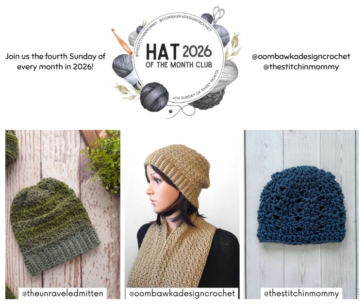 This pattern is part of the Hat of the Month Club hosted by Rhondda of Oombawka Design and Amy at The Sitchin Mommy. I released a matching scarf pattern for their Scarf of the Month Club last week!