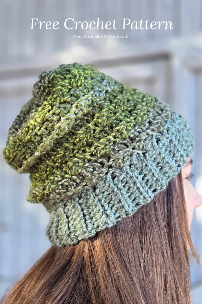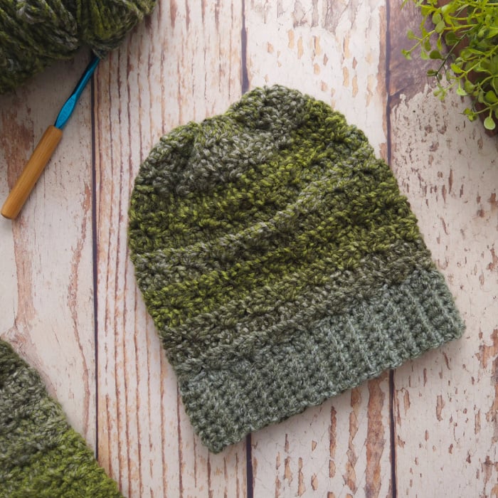 This textured crochet hat uses just a little bit of self-striping bulky yarn. It features my version of the Modified Silt stitch.