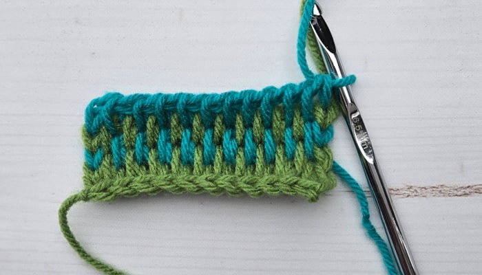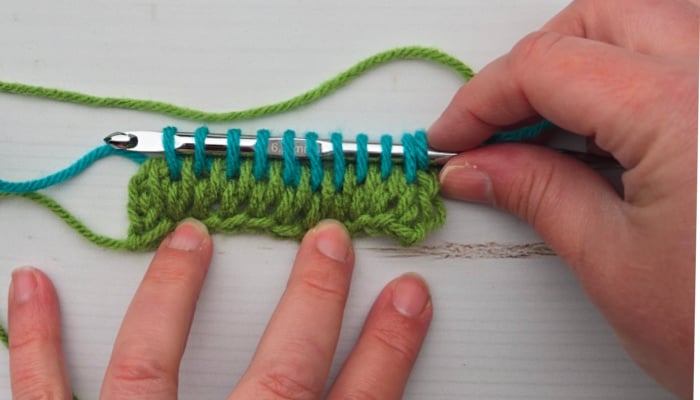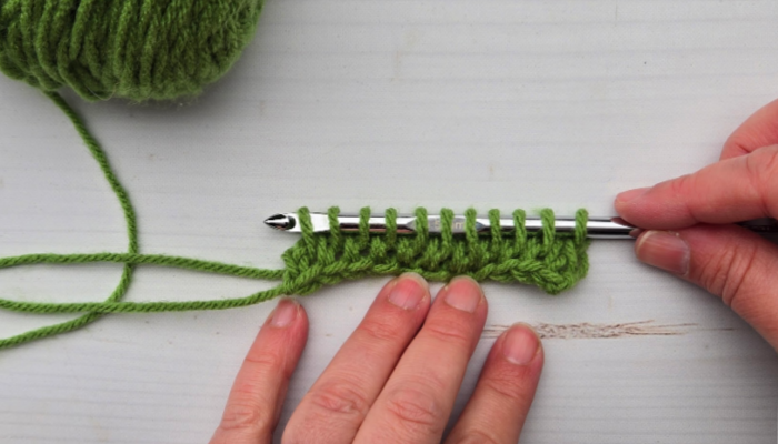 Tunisian Full Stitch (TFS): insert hook from front to back in space between sts, yo, pull up loop