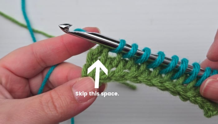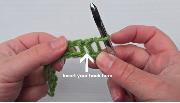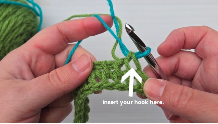 - When inserting your hook between stitches, be careful not to go between front and back vertical bars, as this would be a knit stitch.
