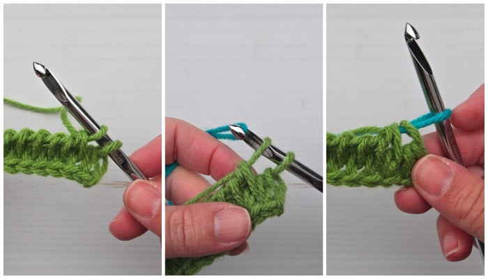 B: yo, pull through 1 loop, *yo, pull through 2 loops, repeat from * across. 1 loop remains on hook. See pattern notes for information about color changes.