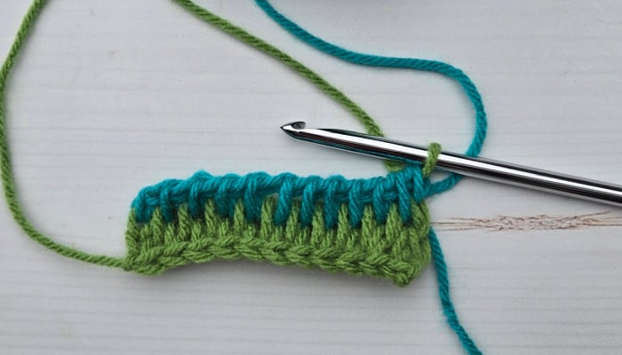 End with an LTS and complete a standard return pass. If you are changing color, work the return pass until there are 2 loops left, yarn over with the new color, and pull through the final 2 loops.