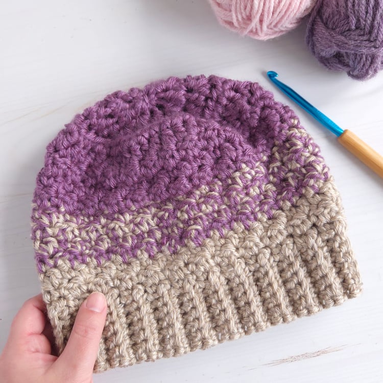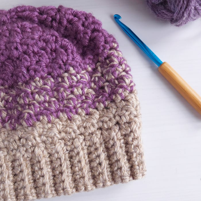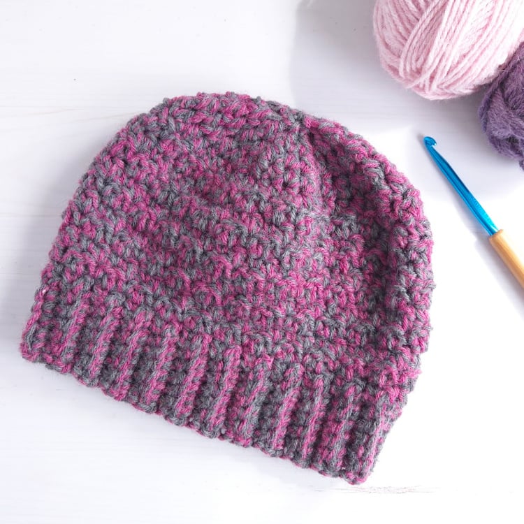The Lemon Peel Stitch Hat is crocheted from the bottom up, starting with a ribbed brim using a double strand of yarn. It is quick to make and is easy to customize the size and color.